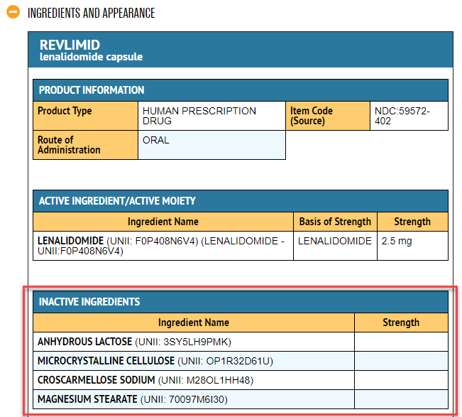 One thing I haven’t mentioned is that DailyMed also provides the ability to download every single product label in XML. If we were to download the specific XML file for this specific Revlimid label on the DailyMed drug label download page, and then find the specific section within the 9530 lines of XML that contains inactive ingredient information, it would look like the code below. You may notice some similarities between the picture of the table on the website and the structure of the XML — look for the inactive ingredient names in both.
